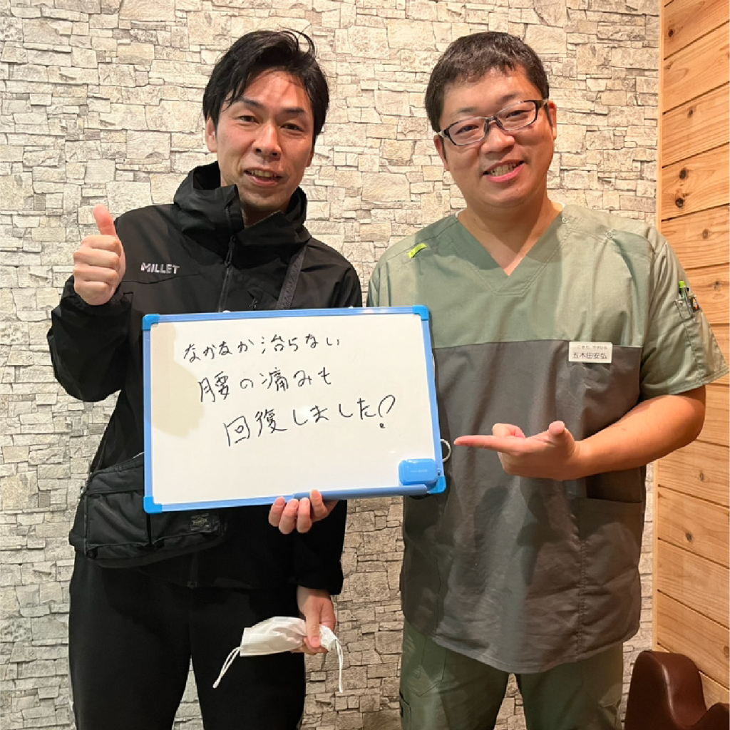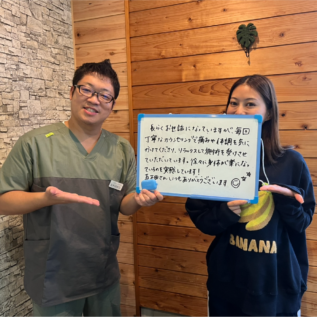 五木田先生には、鍼治療、ストレッチ、マッサージ、骨盤矯正など、多岐にわたる治療をお願いしています。効果は抜群で、知識も豊富な本当に頼りになる先生です。また、家でできるケア方法も丁寧に教えてくださるので、毎回とても参考になります。