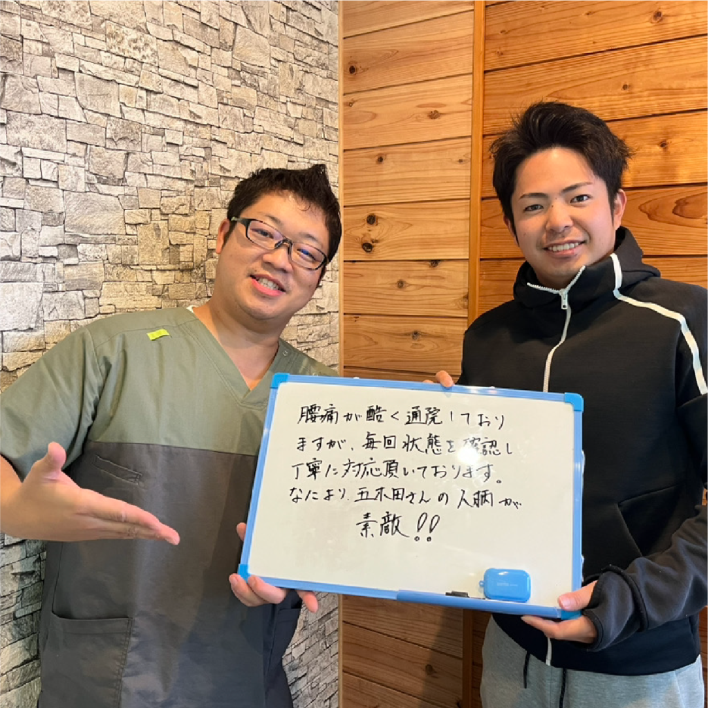 sena ishinoTrustindex は、レビューの元のソースが Google であることを確認します。 1回の施術でめちゃくちゃ楽になりました! また次回も引き続きよろしくお願いします! 曽我陸斗Trustindex は、レビューの元のソースが Google であることを確認します。 高校生以下でも鍼やカッピングを使った施術を受けることができ、日常生活での疲労や、部活動などで疲れている時、また大会の前などさまざまな場面で身体の状態を良くしてくれます。 先生や整体院の雰囲気がとても明るいのでリラックスして受けれます。 お値段もリーズナブルなので初めて針を受ける方にもおすすめです。 em Fu-Trustindex は、レビューの元のソースが Google であることを確認します。 前院より鍼治療を中心にお世話になっています。 私はスポーツ選手ではありませんが、日頃の体の不調に丁寧に対応していただけます。 何より効果が実感できます。オススメします。 高橋洋Trustindex は、レビューの元のソースが Google であることを確認します。 マッサージから始まります 心地よい痛みで気持ち良いです 鍼治療は刺す時だけズーンとした響きがありその後は痛みなどありません 初めてのカッピングやバチンバチンとする衝撃波?の治療は面白いと思いました 面白いだけでなく これらの治療の総合効果で身体も軽く可動域も広くなり スポーツ(マラソン大会)でも自己ベスト更新が連続で出るようになりました 嬉しいかぎりです! 頼りになります‼︎これからもお願いしたいと思います ayuTrustindex は、レビューの元のソースが Google であることを確認します。 先日、前十字靭帯断裂オペ後のケアで伺いました。 まず院内がとても綺麗で、 とても好きな雰囲気で病院感がなく落ち着きます。 五木田先生には高校の頃からお世話になっていますが、豊富な知識で検査などもしっかりした上で良くないところを的確に伝えてくれます。 その上、優しくて面白くて元気をもらえます! 後頭部の張り感や、オペ後の麻痺した部分がお灸や鍼で緩和してびっくりしました! またよろしくお願いします!! 賀澤悠(悠&虎絆&柚絆)Trustindex は、レビューの元のソースが Google であることを確認します。 先生が以前在籍していた接骨院で初めて受けた施術が他の先生より違う観点で見てくれて寄り添ってくれてそれから熱烈なファンで鍼治療受けたらかなり調子良く体メンテで今回開業されてから更に虜になりました。是非初めての方も悩んだら先生へ Masahiro MatsumuraTrustindex は、レビューの元のソースが Google であることを確認します。 先日、伺わせていただきました! 先生もとても親切、丁寧に施術をしてもらい腰痛も良くなりました! 鍼の方も初めて行いましたが、痛くもなくとても気持ち良かったです。 身体の不調の方、是非おすすめです! まけTrustindex は、レビューの元のソースが Google であることを確認します。 とても良い治療を受けれて特に上半身がかなりリラックスできるようになります 07 happyTrustindex は、レビューの元のソースが Google であることを確認します。 身体のコンディションを整えられ、競技に全力で取り組める身体にしてくれます! 怪我はもちろん、違和感でも治療してくれるので、とても頼もしいです。 自分ではケアが届かないため、これからも通わせて頂きます! 日髙志允Trustindex は、レビューの元のソースが Google であることを確認します。 症状に合った治療を行ってくれます。皆さんにもお勧めできる所です。