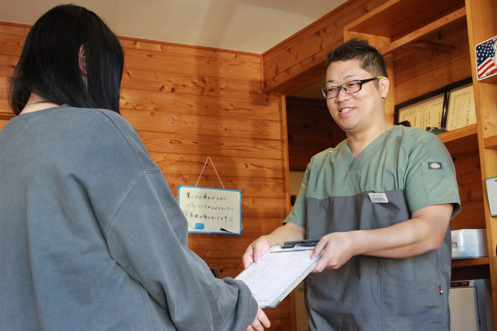 受付にて、問診表をお渡しします。当てはまる箇所や悩みについて自由にご記入ください。