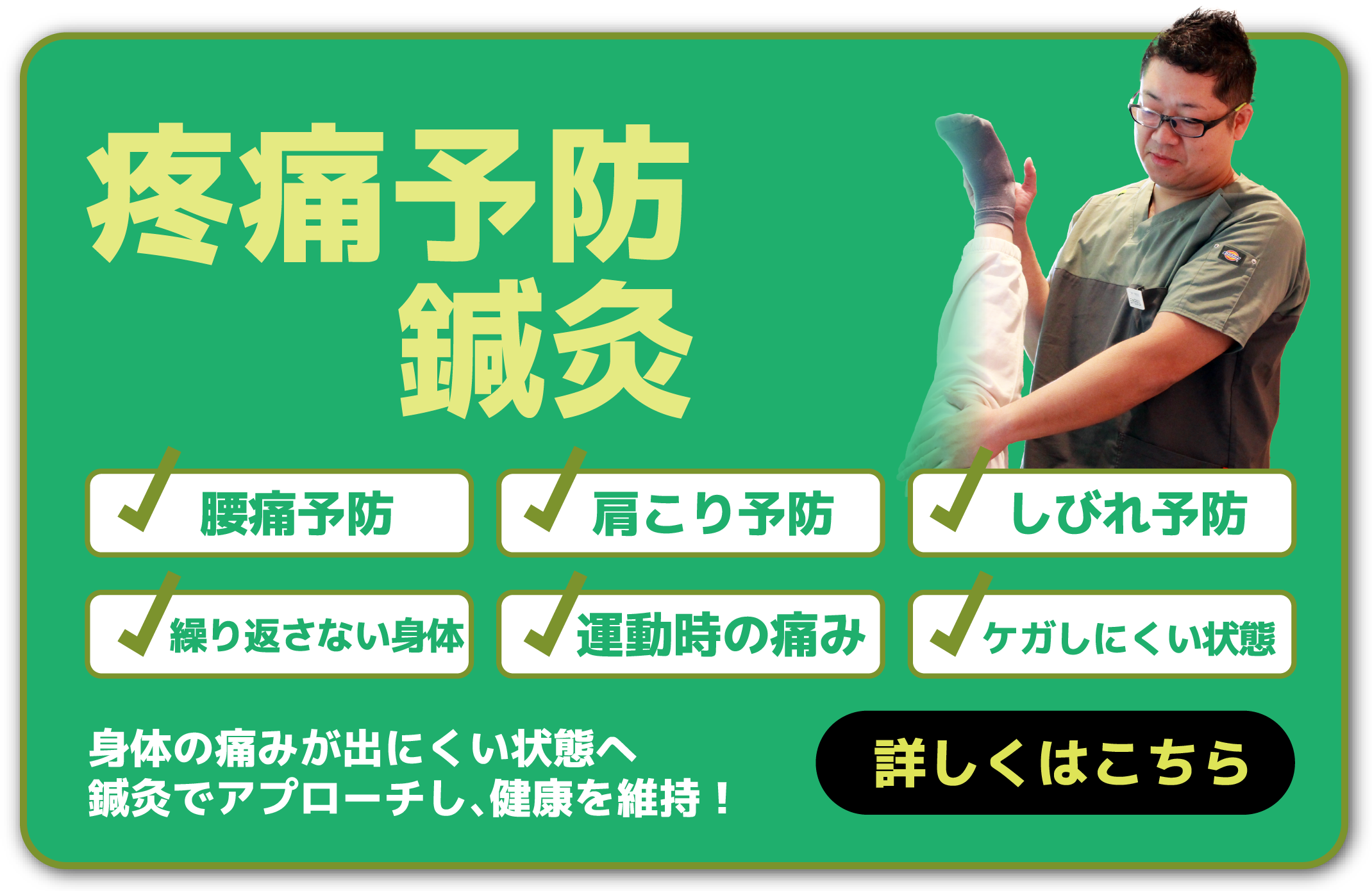 痛みを解消したから良いわけではありません。その後の運動や生活において、繰り返さない身体を手に入れることが大切です。